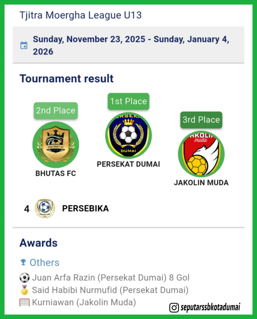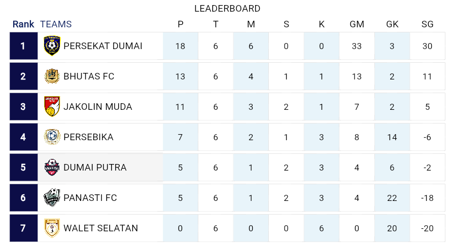 - Top Skor: Juan Arfa Razin (Persekat Dumai) 8 Gol